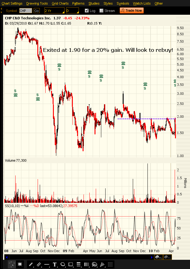 I am going to put some money to work using this strategy. Part of this strategy is buying the big dips, so I will have 3 buy orders in place. I am looking for big volume from months ago followed by a sell off. At that point I want the chart to look like it has an upset stomach or just isn't comfortable with its base. I do not care about the fundamentals so please do not comment on there debt to equity, EPS, liquidity, and so on. These are not quick hits!!!! This will take 6-8 months to work and they will be about low risk entries. My targets on these trades will be 40%+ returns.